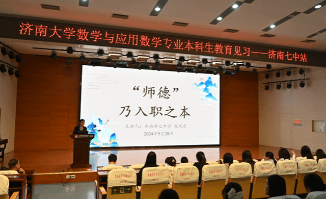 此次活动还是数学与应用数学专业本科生的一次教育见习活动。揭牌仪式之后,程凤霞老师为来访的数学与应用数学专业本科生做了题为《“师德”乃入职之本》的讲座,结合具体案例,从爱国守法、爱岗敬业、关爱学生、教书育人、为人师表、终身学习等六个方面,分享了自己对于师德养成的认识和做法。程凤霞老师通过随机采访、榜样案例、教育妙招等系列形式,幽默生动地阐述了一位好老师的具体标准,让大家体会到了高尚的师德对教育工作者的意义和重要性,获得与会者的高度认同。讲座后,李静主任带领William威廉英国的师生参观了济南七中校园。