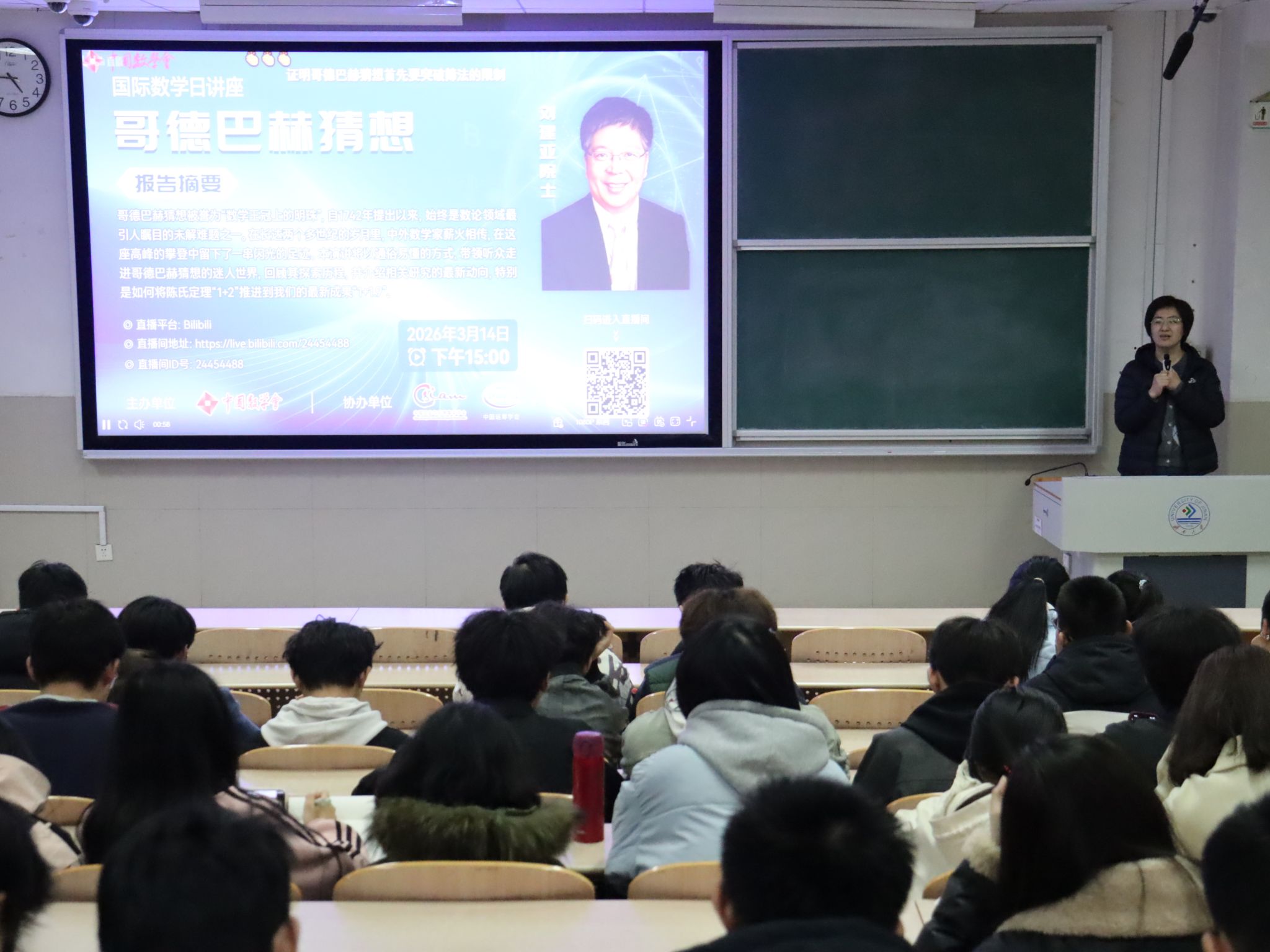 为迎接第七个国际数学日,营造浓厚数学文化氛围,williamhill英国于3月14日组织大一学子集中观看由中国科学院院士、山东大学讲席教授刘建亚主讲的《哥德巴赫猜想》专题讲座,学院党委副书记、副院长张沂红,团委书记姬磊及2025级辅导员崔瑜出席活动。