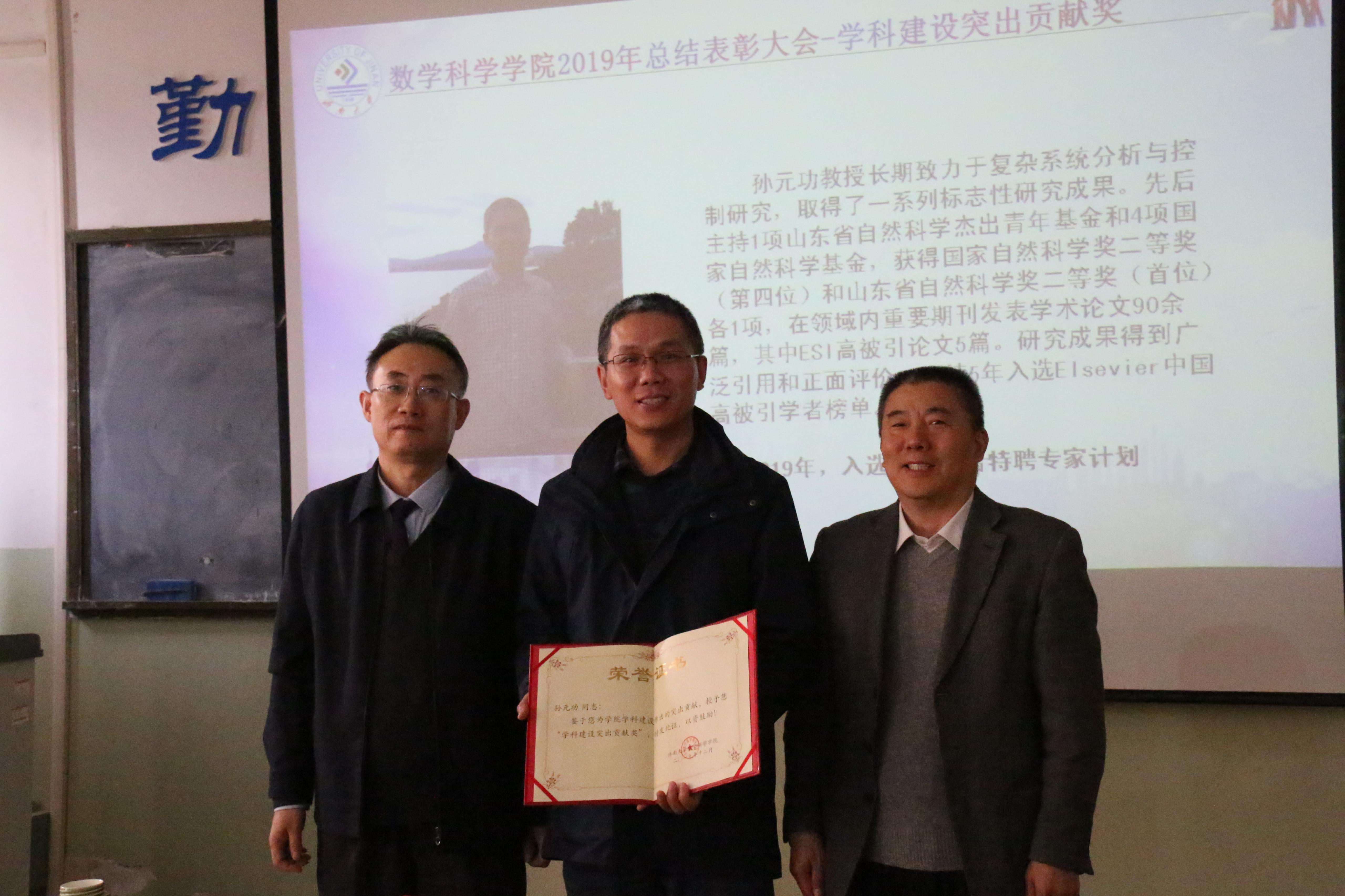 孙元功荣获学院学科建设突出贡献奖,孟德洋、赵华磊荣获学生科创突破奖,张苏梅、孙书荣、李可峰、陈兆英、刘春燕、张超、孙莹、韩振来、张永祥、郑艳玲、冯琳荣获 “优秀教育教学工作者”称号,孙元功、张永祥、陈观伟、刘红军、孙书荣、邵长国、赵以阁、杨健、宗雯雯、张志强、束彦军荣获“优秀威廉英国者”称号,孙莹、赵华磊、赵以阁、孙钏峰荣获优秀班主任,吴立军、马巧灵、陈兆英、孙莹、刘艳、郝志峰、张颖荣获工会活动积极分子,复杂系统分析与控制研究所、数学与应用数学系、数学教育教研中心、教学管理办公室荣获“先进集体”称号。