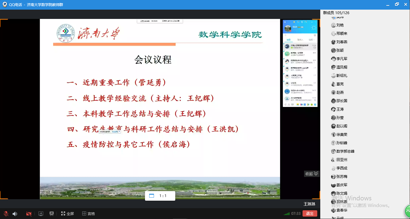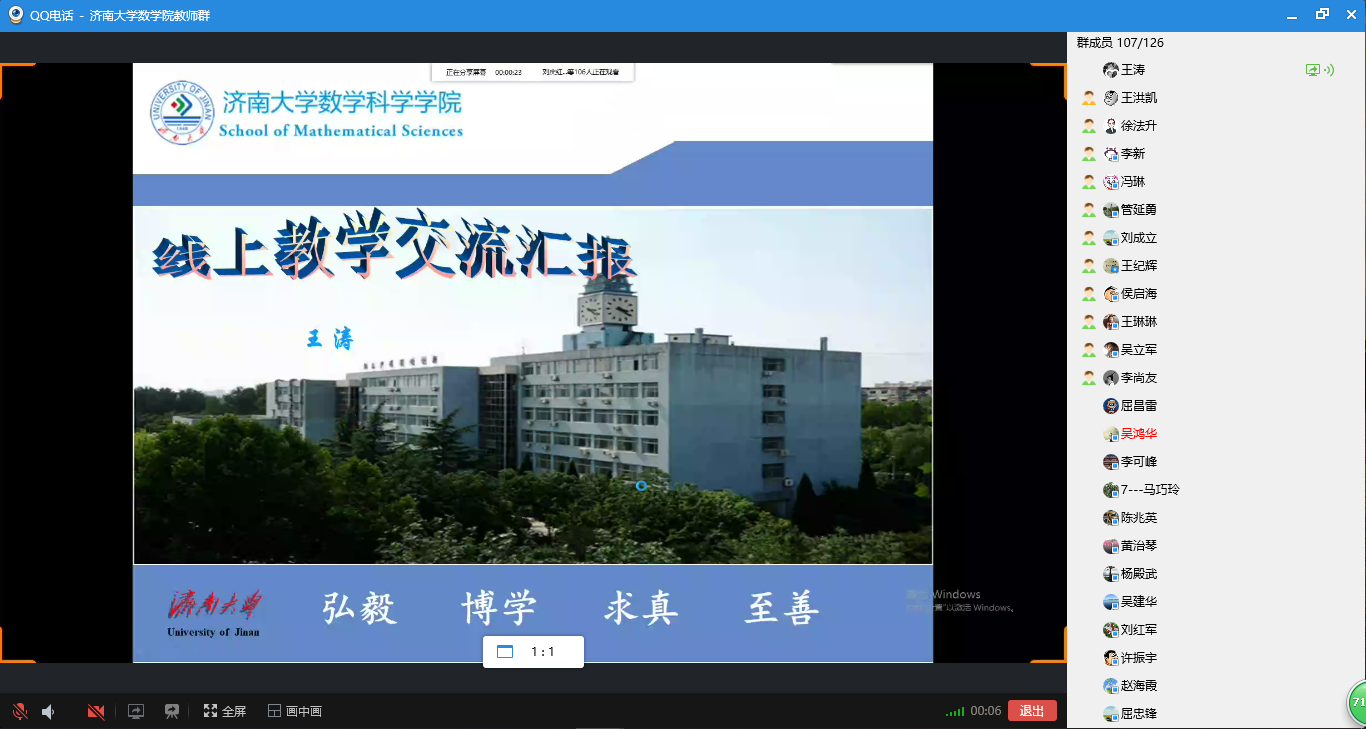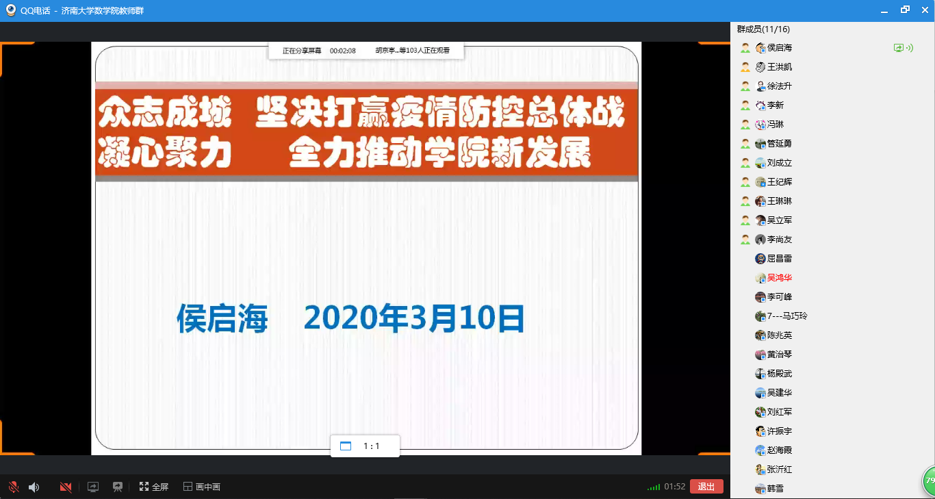会上,张苏梅、苗丽安、吕洪波、李西成、权培英、刘春燕、王涛等7位老师先后发言,从授课软件选择和使用、课前预习发布和监督、课堂气氛营造和调动、课后作业批改及答疑、师生网上互动和交流等多个方面分享了各自心得体会,并就授课过程中遇到的问题和困难进行了深入研究。老师们一致认为,线上授课相较于线下授课更能考验教师的责任心和自信心,是对教师的责任心、教学能力和水平的实战检验。对线上授课体验,老师们普遍感觉,“还是挺幸福的,学生们非常配合,感觉非常舒畅”,纷纷表示在接下来的授课过程中将积极吸取优秀经验,力争做到“尽管跟学生的空间不在一起,但是要跟学生学习的心在一起,让他们感受到老师的陪伴”。