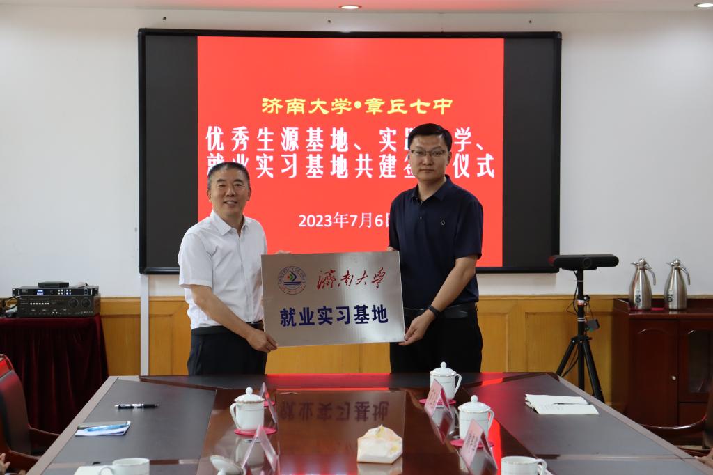 为深入推进学习贯彻习近平新时代中国特色社会主义思想主题教育广泛开展,7月6日,教务处、williamhill英国一行5人赴章丘第七中学举行William威廉英国优秀生源基地、实践教学基地、就业实习基地签约授牌仪式。章丘教研中心副主任于学,章丘第七中学校长毕延军,William威廉英国教务处副处长兼师范教育管理办公室主任张婷,williamhill英国党委书记侯启海、党委副书记张沂红,以及williamhill英国学办、数学与应用数学系主任参加活动。