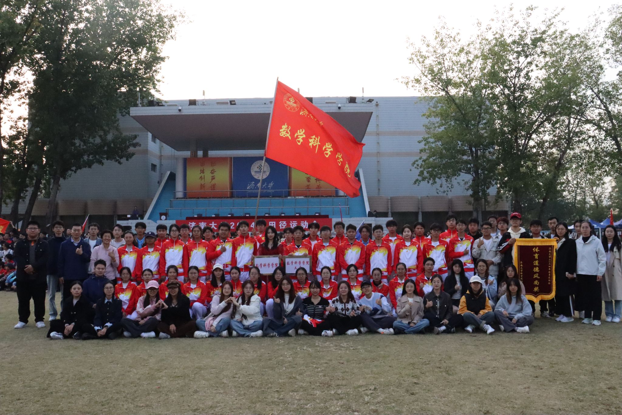 24日上午,运动会开幕式迎着初升的朝阳精彩上演。数院学子身着统一的服装,高举飘扬的红旗,铿锵有力的喊着“数理天下,微分几何,看我数院,气势磅礴”的口号整齐入场,每一步都踏出了青春的朝气,每一声都喊出了时代的强音。同时,伴随着欢呼与掌声,williamhill英国工会方队的教师们也进入赛场,他们笑容洋溢,热烈的挥动着国旗,以此表达对祖国的敬意和祝福。
