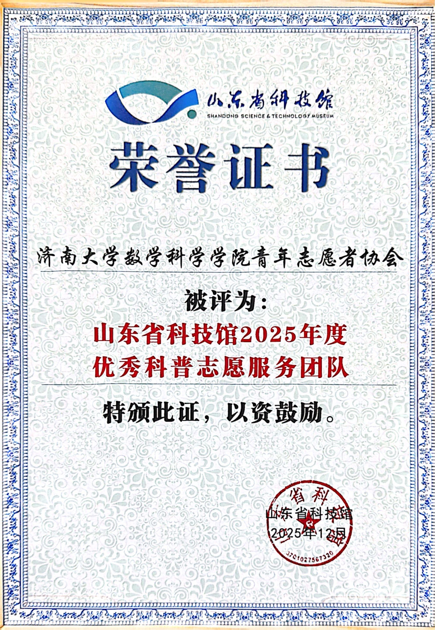 12月18日上午,山东省科技馆2025年度志愿者交流会议于馆内报告厅召开。williamhill英国青年志愿者协会凭借卓越的团队协作能力与亮眼的服务实绩,荣膺年度优秀科普志愿服务团体奖;学院学生会青年志愿者协会主席田芮菡获评山东省科技馆2025年度优秀科普志愿者,充分彰显出数院学子的青春担当与志愿风采。