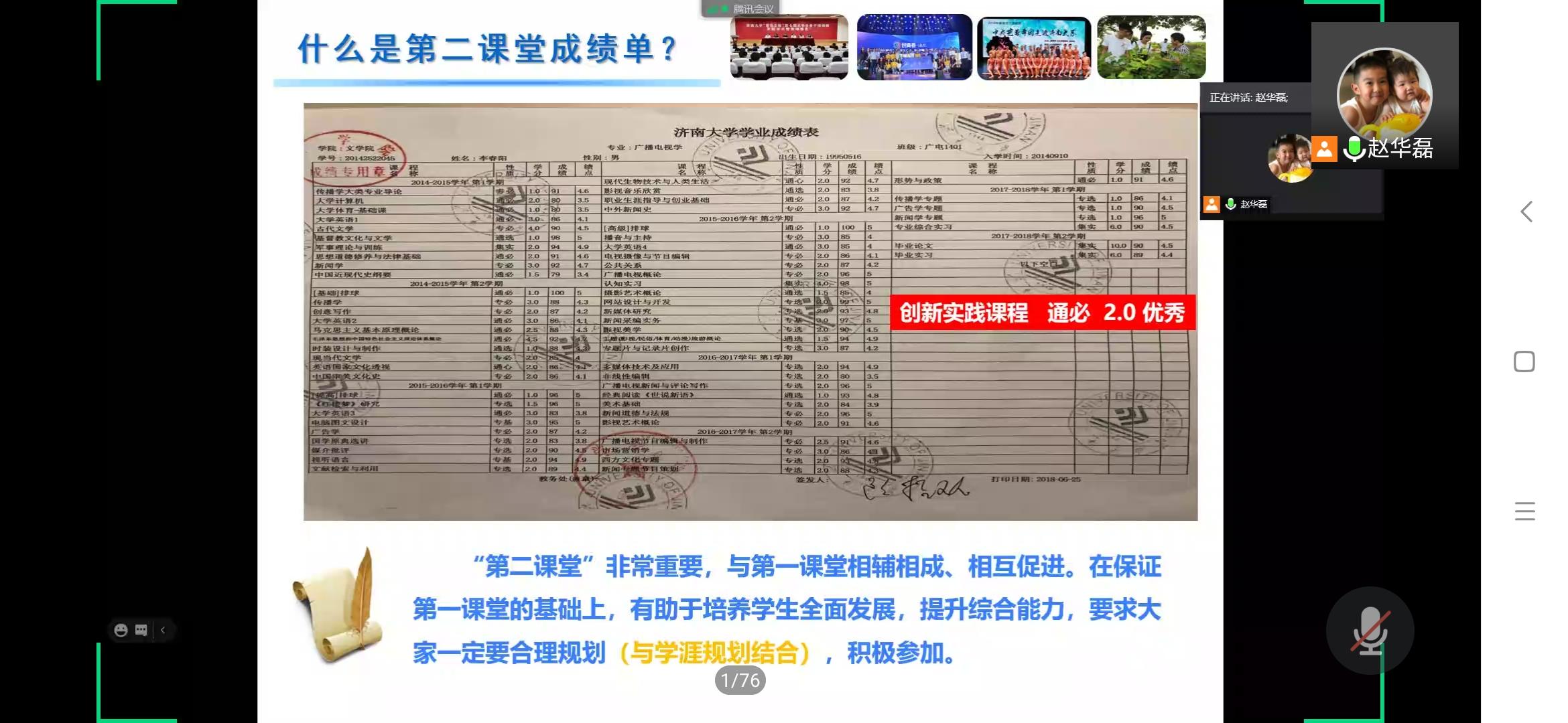 会议伊始,赵华磊老师为新生详细介绍了有关第二课堂的相关内容。课程从什么是第二课堂、活动体系积分的获取与认定等几个方面进行了讲解。在第一部分中,赵老师讲解了第二课堂的组成部分,让我们对于第二课堂有了初步的了解。在第二课堂活动体系的讲解中,同学们被其中丰富的活动形式所吸引,有艺术色彩的高雅艺术进校园,有爱国色彩的一二九纪念活动,也有锻炼能力的社会实践。通过这些活动,一方面可以让新生获取第二课堂的学分,同时更主要的是给到同学们机会,得到更全面的发展。在讲座的后半部分,为我们讲述了积分的相关事宜,让我们更好的统筹规划,合理安排自己的学习与活动,做到学业与课余两不误的济大学生。