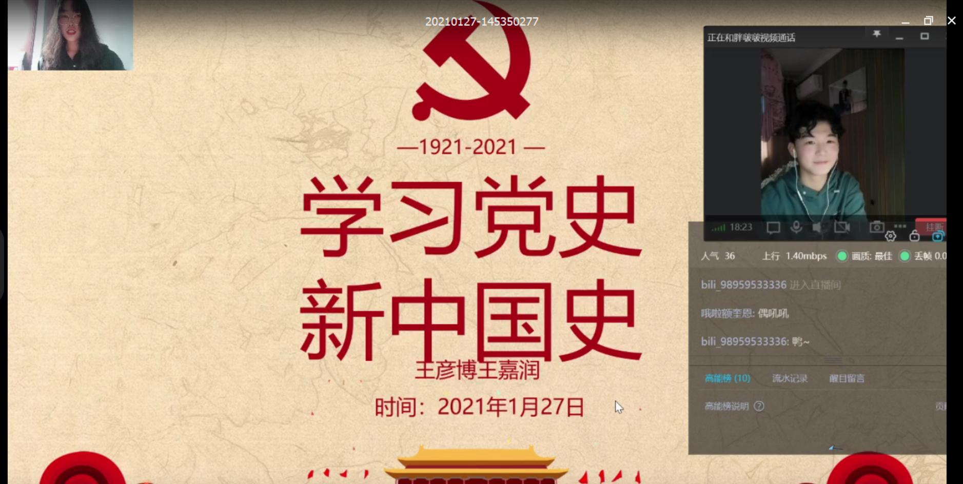 为了保证直播活动的顺利进行,保证此次活动的质量,王彦博与王嘉润两位同学在前期做了一系列准备。两位同学以图片和小视频的形式展示ppt来讲解。讲解内容从党史和新中国史两个大部分分别展开。直播首先由王彦博同学开始有关党史的讲解,从学习党史的意义为出发点,一步步引出了如何学习党史等一系列内容,让同学们充分认识到了没有共产党就没有新中国,只有中国共产党才是中国特色社会主义事业的坚强领导核心。在活动的后半段王嘉润同学讲述了新中国史,以土地改革、抗美援朝、社会主义制度的确立等事件为线索,充分展现了从建国到新时代,我们的国家是如何一步步由弱变强的伟大历程。通过两位同学的讲解,让我们深切地感受到这来之不易的幸福生活,以及老一辈革命党人的坚定信念和决心。