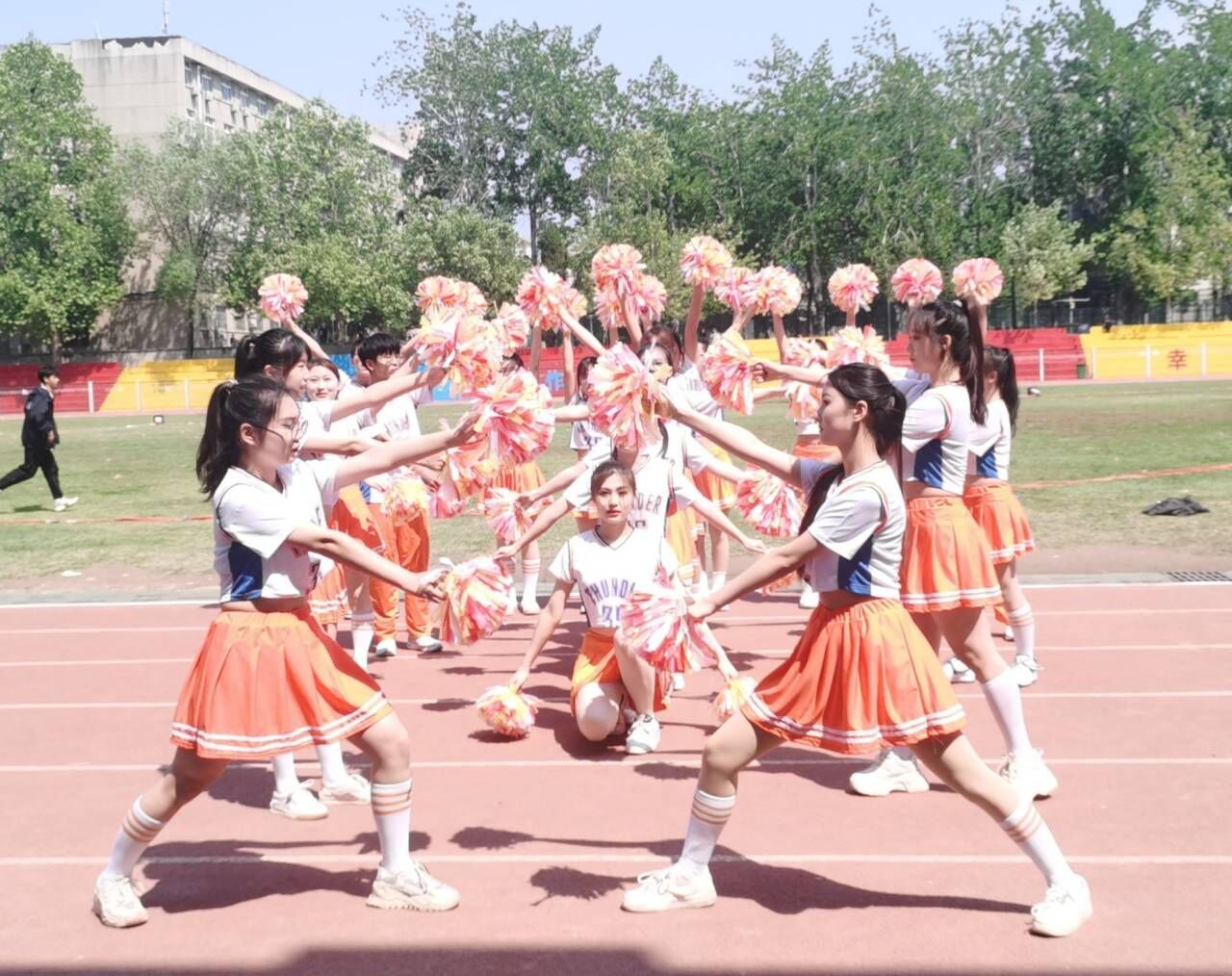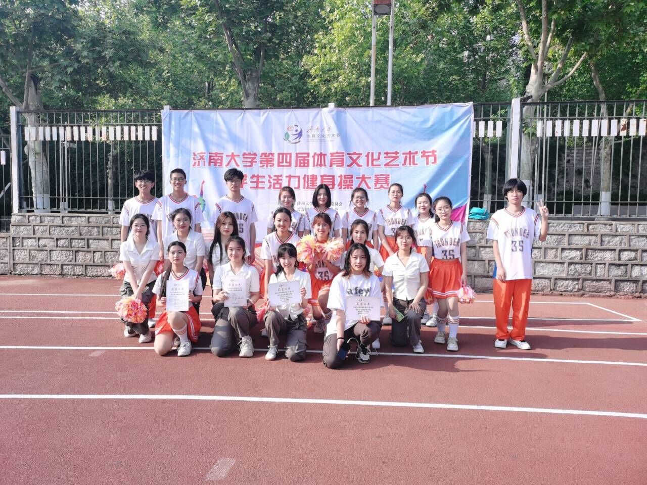 历经一个月的辛勤学习和排练,williamhill英国参赛团队以十分饱满的状态应对此次比赛,“数理天下,微分几何;看我数院,气势磅礴”队员们喊着嘹亮的口号,昂首挺胸、步伐整齐地走向主席台。队员们身着的橘黄色队服彰显williamhill英国的激情与奔放,灿烂的笑容更是征服了全场观众。健美操音乐响后,队员们提起十足的精神,用力地挥舞手中的花球,利索干练,毫不拖泥带水。每一个动作都追求标准,每一个走位都力达整齐,每一个细节都保证完美。虽然中途出现了音乐播放事故,但是每个人都保持冷静,继续整齐地完成接下来的动作,并在音乐恢复时精准地卡上了节拍,保证了整个舞蹈的流畅,给评委老师们留下了极其良好的印象,最终取得了9.30的高分,成功将比赛一等奖收入囊中。