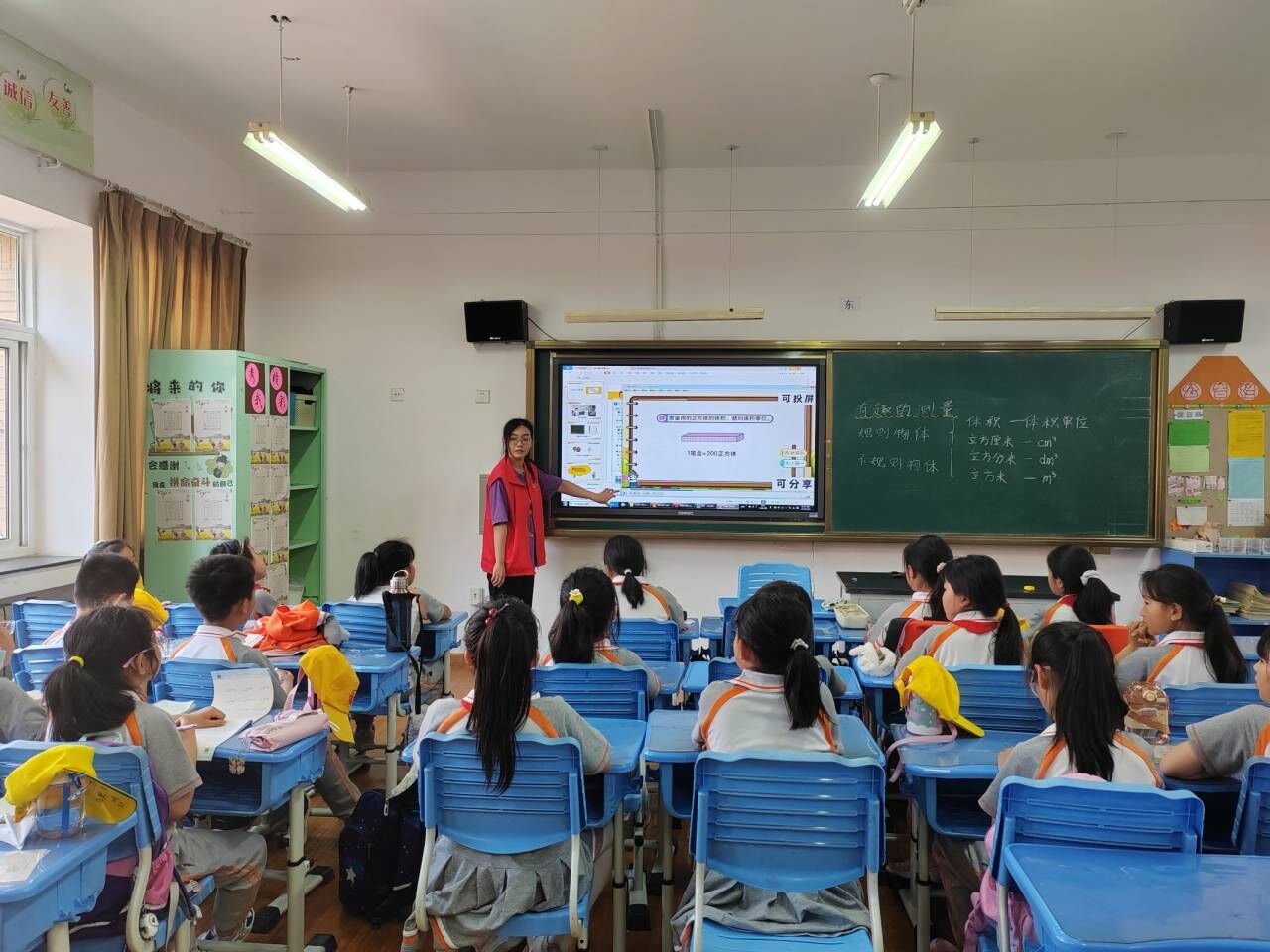 课堂开始,志愿者首先列举了黑板、课本、西瓜、芝麻等常见的物品,进而引出了数学知识里“体积”概念。接着,志愿者通过有趣的视频使同学们对“体积”有了进一步的了解,并就体积的测量问题展开了课程的内容。第一部分,志愿者向大家展示了正方体,长方体,圆柱等规则图形,并进一步给出了规则图形的体积计算公式,使同学们掌握了规则图形体积的计算方法。第二部分,志愿者提出“不规则图形该如何计算体积”的问题,引出了有趣的王冠测量,乌鸦喝水等故事,并组织了同学们进行测量石子体积的小游戏,让同学们以小组讨论的方式利用石子、量筒和一定量的水来测量石子的体积。随后,每个小组都开始了激烈的讨论,并且动手尝试了多种方法,最终计算出了石子的体积。最后,志愿者们对体积的测量方法作出了总结,进一步巩固了课堂知识。
