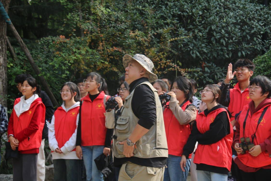 无痕讲师提出了赏鸟原则,在将赏鸟原则谨记在心后,同学们“循鸟入境”。在循鸟途中,大家耐心观察,认真记录鸟类形态特征,按照指导关注鸟类的生存环境。同学们手持望远镜,在五龙潭公园的林间、草地中发现了许多平时未曾留意的鸟类身影—灰喜鹊、山斑鸠、灰椋鸟、小鷿鷈等。同学们在潭西诗社和秦琼祠中找到了中国传统文化中鸟类的形象,并了解到了这些鸟类在中华传统文化中的意蕴。随后,无痕老师在五龙潭畔向志愿者们分享了一场大熊猫主题日的无痕环境课堂,讲师展示了大熊猫的第六拇指,大熊猫的濒危等级以及大熊猫的野外调查数量柱状图,讲解了拥抱“自然向好”的重要意义。通过无痕老师和志愿者们的交流互动,志愿者们学习到了保护大熊猫的方法和保护大熊猫这种“旗舰”物种的重要性。