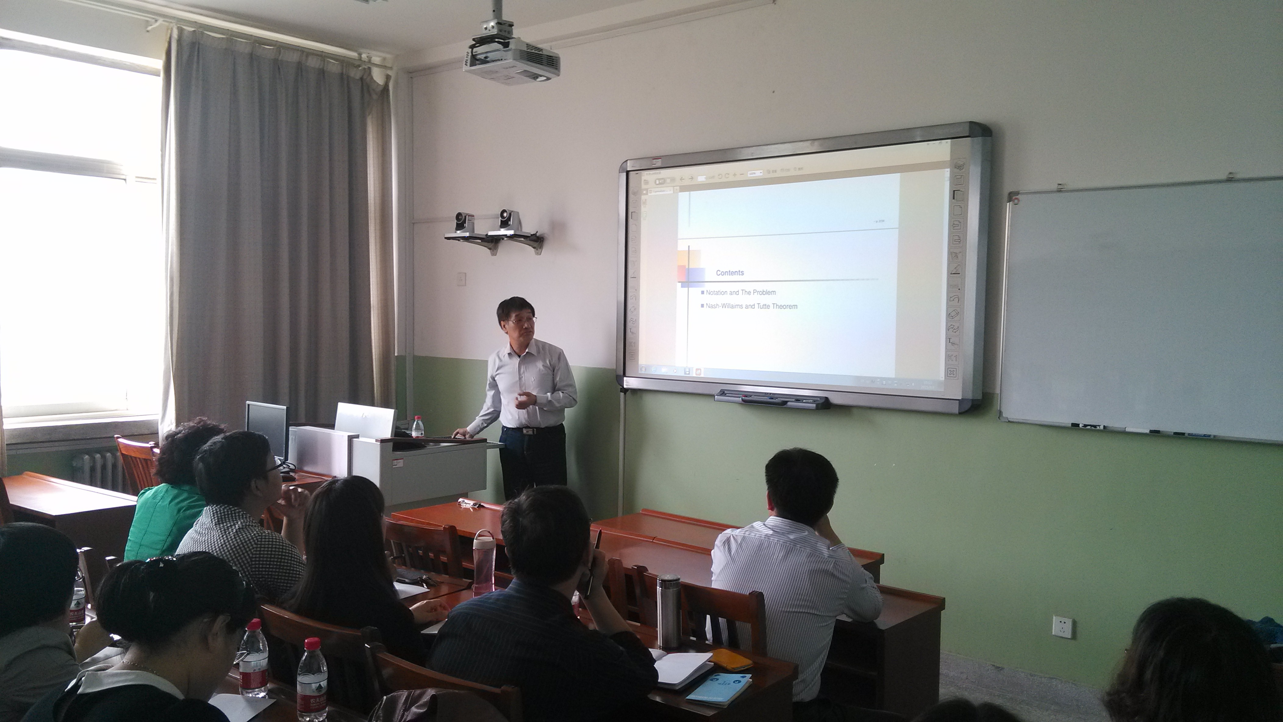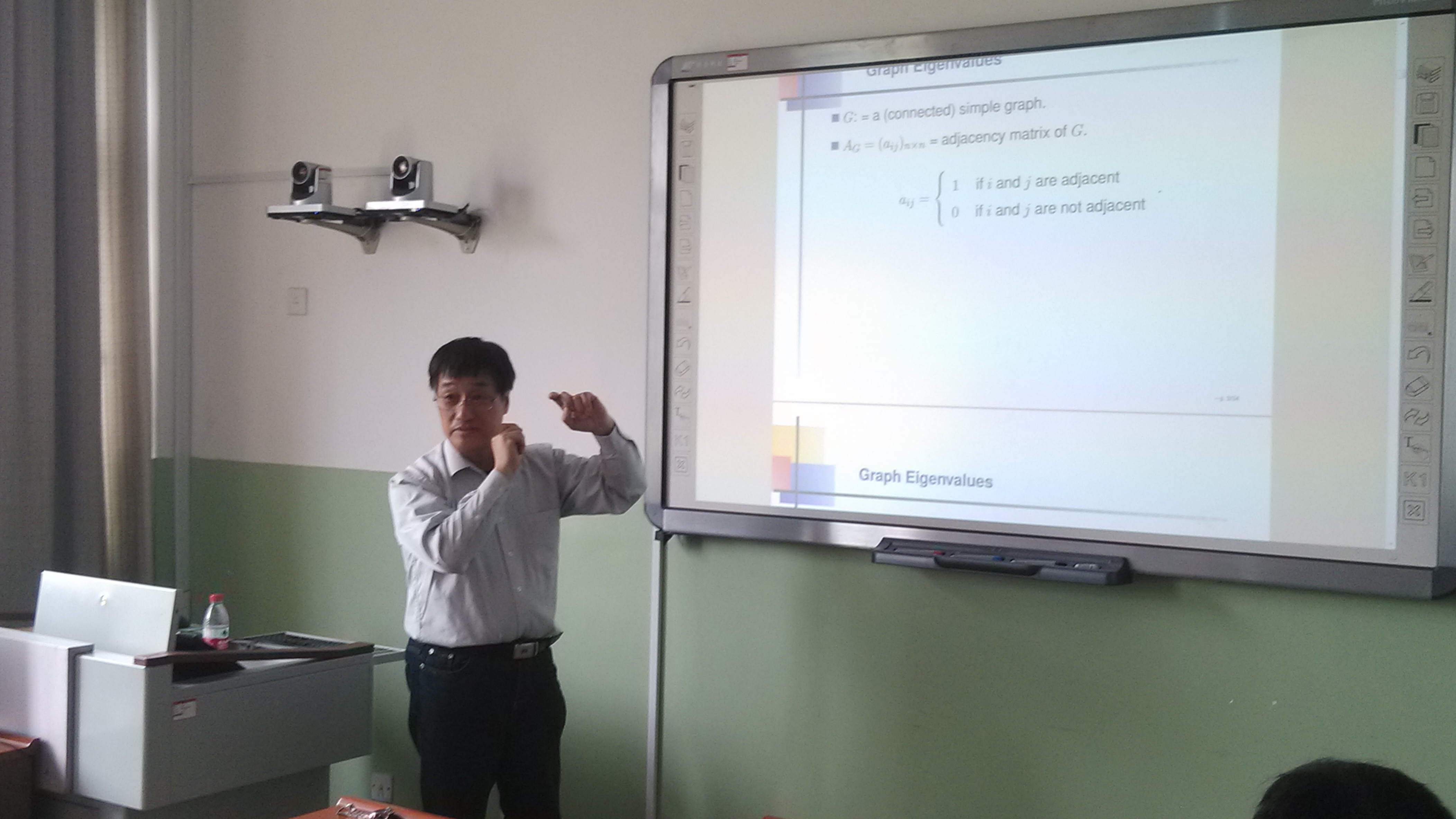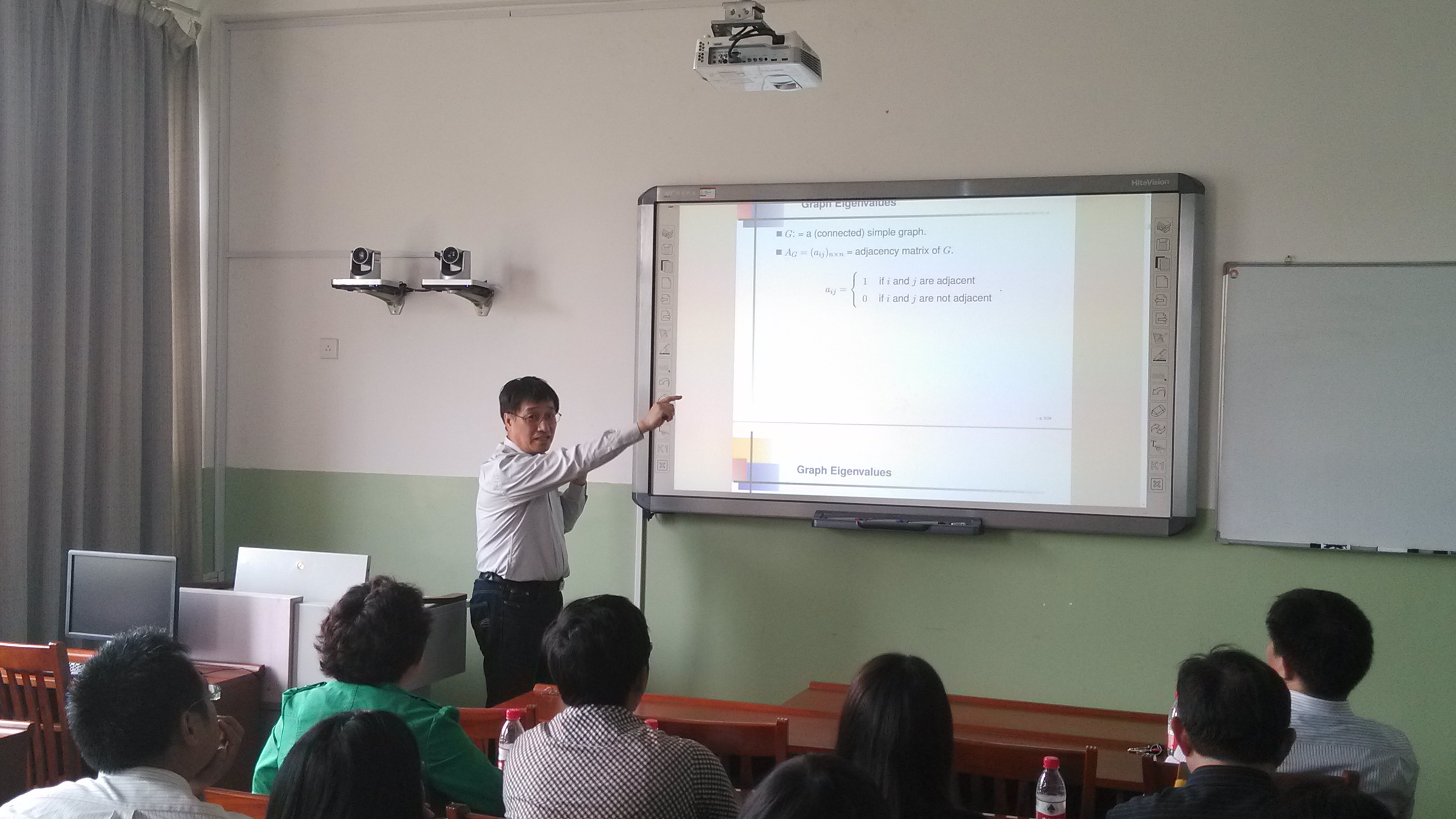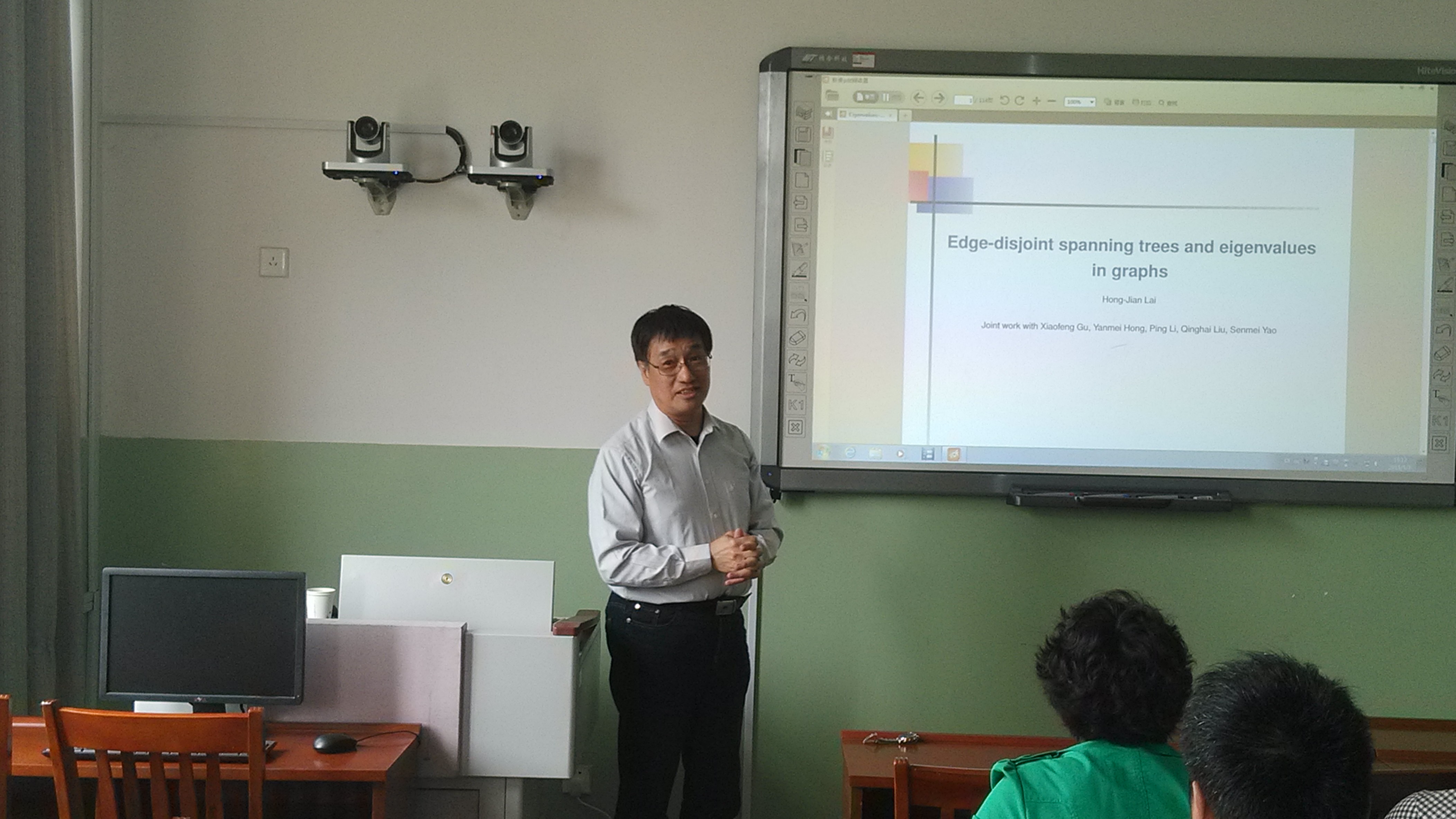 报告会上,赖虹建教授做了《图的边不交的支撑树与特征值》的报告。赖虹建教授从“图的边不交支撑树的个数与邻接矩阵特征值之间关系”的一个猜想出发,介绍了图的邻接矩阵、拉普拉斯矩阵和无符号拉普拉斯矩阵的概念和相关组合、代数方法,详细讲解了问题的研究思路和主要结果,并提出了进一步思考的一些问题。会后,williamhill英国图论与组合优化科研团队的师生们还就组合图论的一些前沿问题和国外研究现状与赖虹建教授进行了探讨和交流。