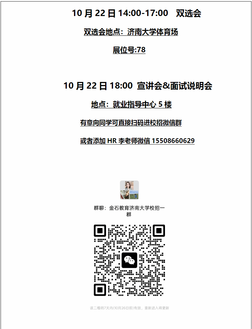 金石教育定于2025年10月22日在校内进行双选会及宣讲会,请有意向的同学提前准备简历,线上或者线下投递简历。