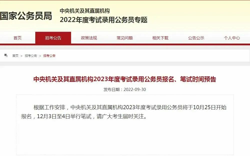 国家公务员局发布招考公告:中央机关及其直属机构2023年度考试录用公务员将于10月25日开始报名,12月3日至4日举行笔试。