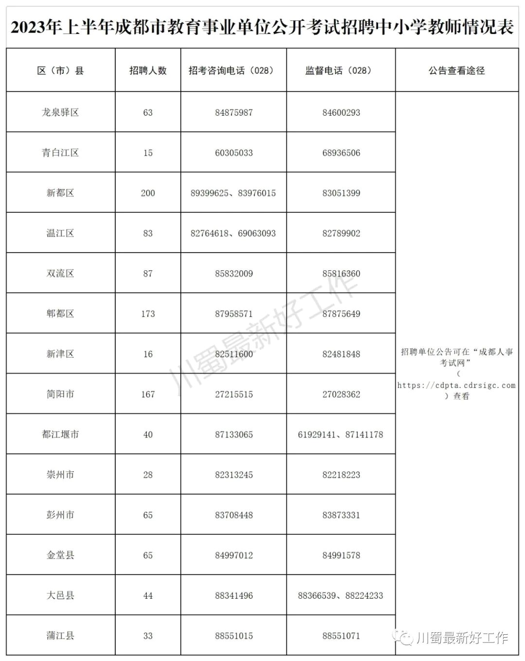 龙泉驿区、青白江区、新都区、温江区、双流区、郫都区、新津区、简阳市、都江堰市、崇州市、彭州市、金堂县、大邑县、蒲江县14个区(市)县属教育事业单位公开招聘中小学教师1079名,见《2023年上半年成都市教育事业单位公开考试招聘中小学教师情况表》(附件)。
