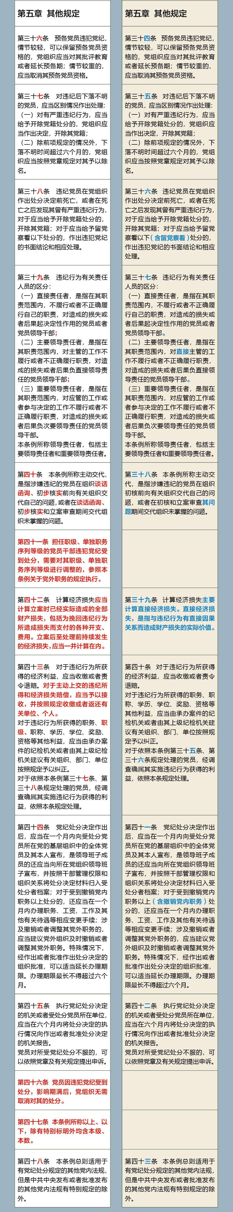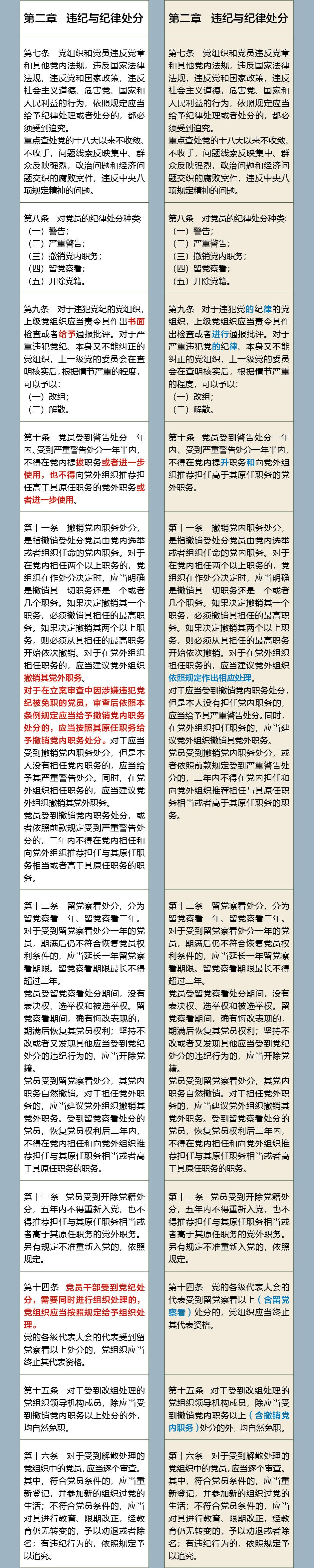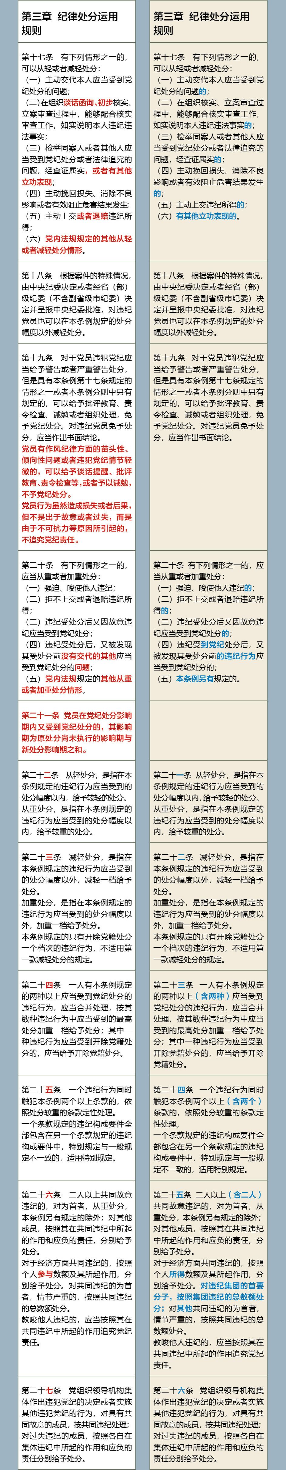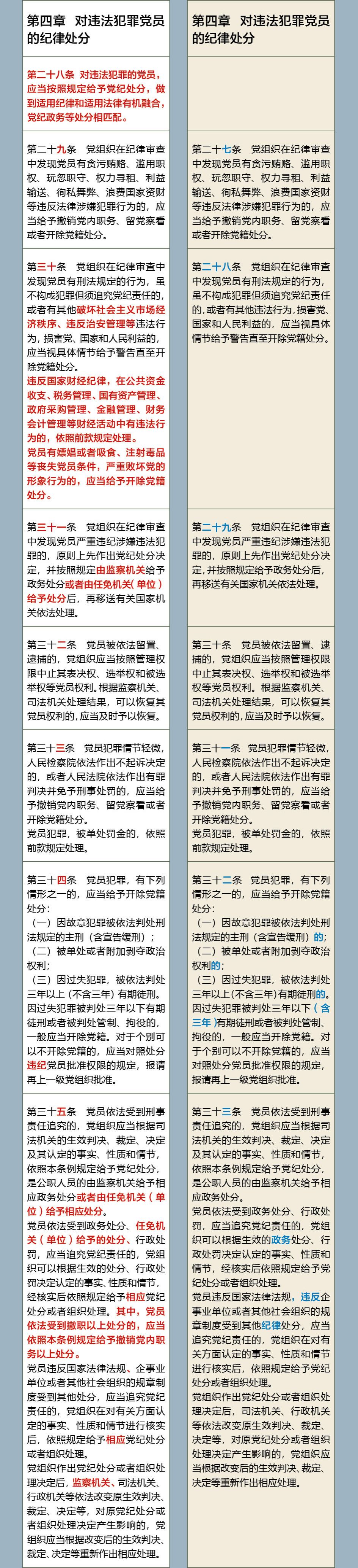 《中国共产党纪律处分条例》修订前后对照表